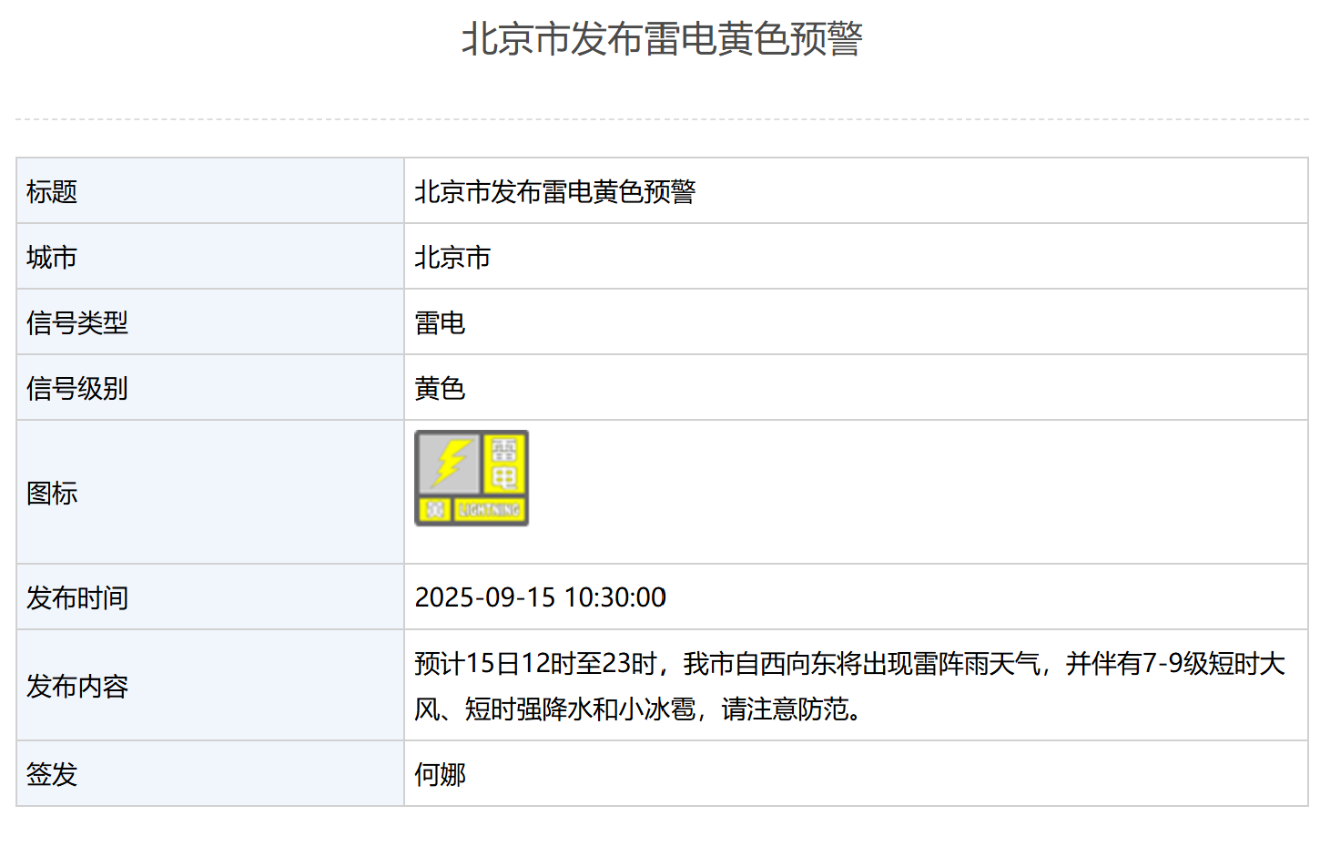 China.com在9月15日报道说,根据北京气象局的说法,9月15日,北京发出了闪电的黄色警告,并警告了强风的黄色警告。北京发布了一条黄色的闪电警告:预计从15日的12:00到23:00,风暴将在我们的城市从西到东发生,伴随着7-9级的短期大风,短期的大雨,几乎没有降雨。请注意谨慎。北京对强风发布了黄色警告:受风暴云的影响,预计从12:00到17:00到15日,短期强风将从西方到东到我们的城市发生,山区的当地阵风可以达到10级或上升。请注意谨慎。